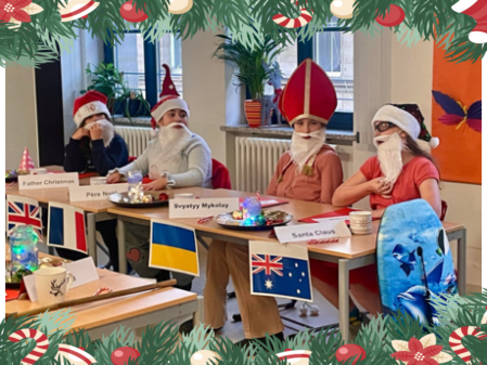 Zu einer ersten gemeinsamen Weihnachtskonferenz trafen sich in der Rosenschule die Weihnachtsvertreter verschiedener Länder, um sich über landestypische Sitten und Bräuche auszutauschen.